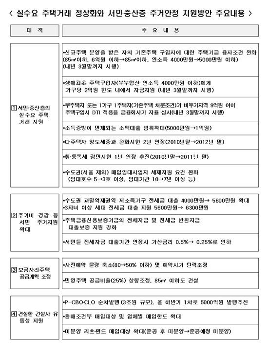 특히 이번 대책은 총부채상환비율(DTI) 금융권 자율 적용, 생애최초 주택구입자금 신설, 주택기금 전세자금 대출한도 등 '주택거래 활성화'와 이에 필요한 자금지원 등에 총력을 기울이고 있다. 또 유동성에 어려움을 겪고 있는 중소건설사에 대한 지원도 마련됐다.