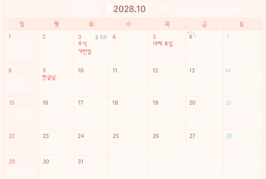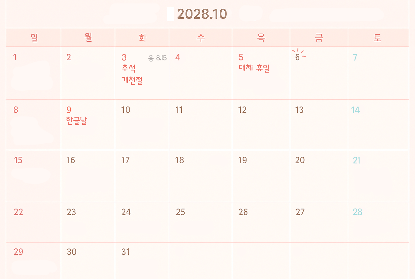 2028년 10월 6일 금요일 휴가쓰면 9월 30일 토요일부터 10월 9일 월요일까지 최장 열흘