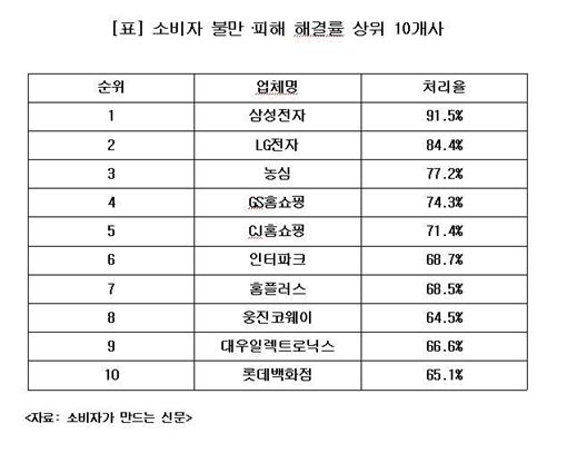 소비자 피해 관련 인터넷 사이트 ‘소비자가 만드는 신문’은 지난 한 해 동안 접수된 총 3946건의 소비자 불만·피해 제보와 해결 현황을 분석한 결과 삼성전자가 해결률 91.5%로 1위를 차지했다고 6일 밝혔다.