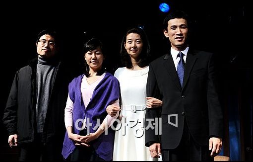 [아시아경제신문 이기범 기자]안경모(왼쪽부터) 연출 , 진경, 송선미, 유오성이 8일 오후 서울 대학로 원더스페이스에서 진행된 연극 '돌아서 떠나라' 프레스 리허설 기자간담회를 마치고 포토타임을 갖고 있다.