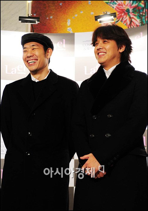 [아시아경제신문 박성기 기자]가수 김진표와 배우 류시원이 17일 오후 5시 서울 영등포구 여의도동 63시티 웨딩홀에서 열리는 유리상자의 멤버 이세준(37)과 영어 동시통역사 강모씨의 결혼식에 참석, 포즈를 취하고 있다.