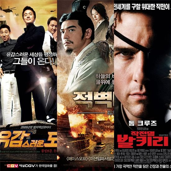 이에 비해 외화는 톰 크루즈 주연의 '작전명 발키리'(이하 '발키리'), 오우삼 감독의 '적벽대전2-최후의 결전'(이하 '적벽대전2') 등 5편의 영화가 한국 영화팬을 유혹하고 있다.