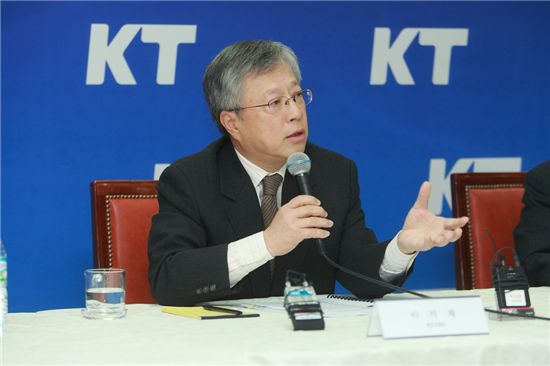 KT 이석채 대표는 20일 KT 광화문 사옥에서 기자간담회를 열고 "KTF와의 합병으로 유무선 통신 컨버전스 산업을 선도해 글로벌 사업자로 변화하고 이를 통해 IT산업이 재도약하는 계기가 되도록 할 것"이라고 합병추진배경을 밝혔다.