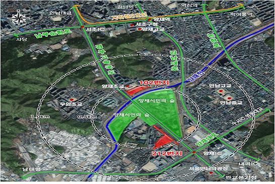 양재동 212번지는 부지면적이 3만1067㎡로 이곳에는 지상 25~35층 공동주택 3개동 총 389가구를 포함 총 619가구의 시프트가 지어진다.