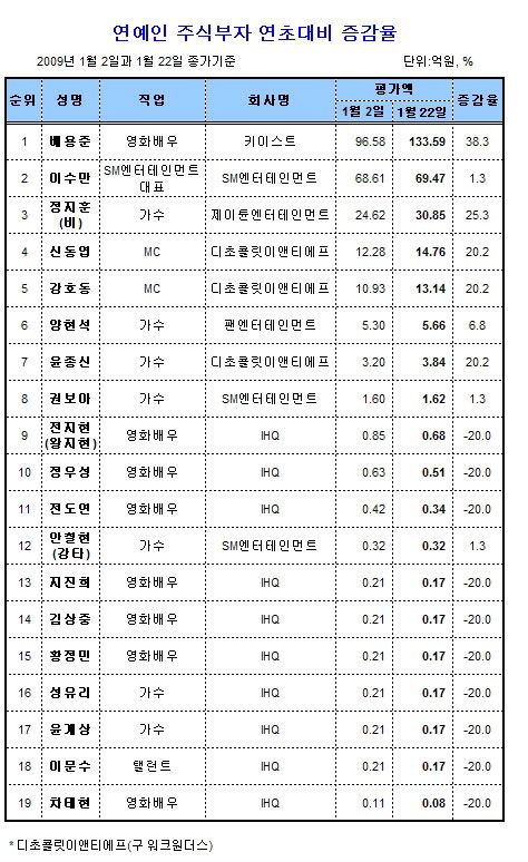 이 조사에서 배용준은 코스닥 상장사 키이스트의 최대주주(지분율 34.6%)인 배용준의 보유주식 평가액은 연초(1월 2일) 96억원에서 38.3%나 급증한 결과 1위를 차지했다. 배용준의 주식자신이 늘어난 것은 JYP엔터테인먼트와 공동으로 드라마 제작회사를 설립하면서 키이스트의 주가가 급등했기 때문으로 평가되고 있다.