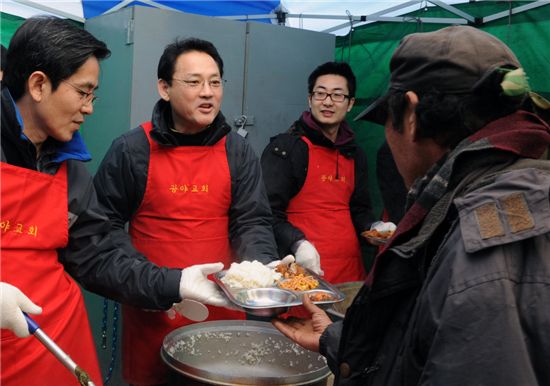 [아시아경제신문 박소연 기자]유인촌 문화체육관광부 장관이 설연휴 마지막 날인 27일 낮 영등포 광야교회(담임목사 임명희)에서 노숙인을 위한 무료급식 봉사활동을 펼쳤다.