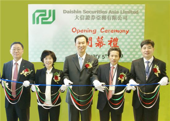 대신증권은 5일 오전 대신증권 홍콩현지법인에서 이어룡 회장과 노정남 사장, 제휴사인 중국 자오상증권의 꿍샤오린회장, 석동연 홍콩영사 등이 참석한 가운데 홍콩법인 개업식을 가졌다고 밝혔다.