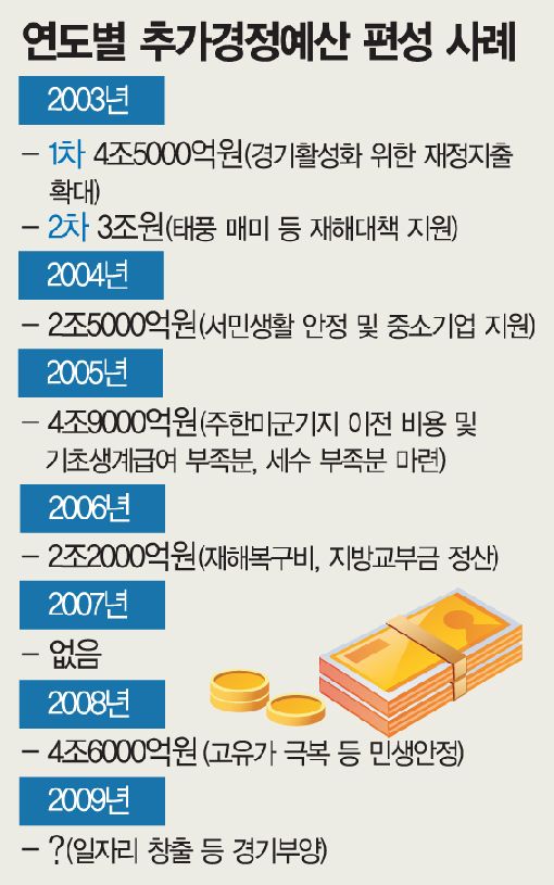 최경환 한나라당 의원은 "애초 예상했던 것보다 경기침체 속도가 빨라 추경을 통해 중소기업이나 취약계층의 숨통을 터줘야 한다. 10조원 이상의 추경 예산을 편성해야 한다"고 주장했고, 야당인 민주당에서도 김진표 이광재 의원 등이 당내 일부 반발에도 불구하고 "실업 대란을 막고 사회안전망을 확충하기 위해 2월 국회에서 추경 예산을 편성해야 한다"고 요구하고 나섰다.