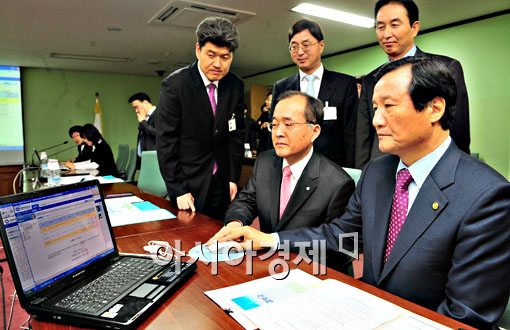 윤증현 기획재정부 장관은 10일 장관 취임 첫 업무로 2008회계연도 총세입부와 세출부를 마감 하고 있다.