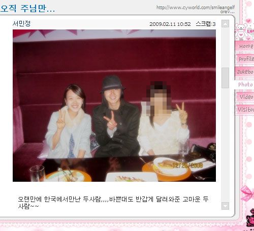 서민정은 지난 11일 자신의 미니홈피에 한국에서 정일우와 함께 촬영한 사진을 공개했다. 서민정은 지난 해 11월말부터 약 2개월가 남편, 딸과 함께 한국에 머문 바 있다. 당시 정일우와 만난 장면을 촬영한 것.