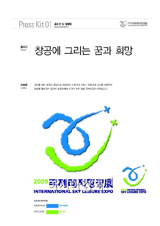 ◇공식 명칭·앰블런·슬로건·캐릭터 결정 = 항공전 공식명칭은 전 국민 대상 공식명칭 공모를 통해 접수된 1501건의 아이디어 중 25%에 해당하는 372건이 ‘레저항공’을 추천해 ‘2009 국제레저항공 전’(International Sky Leisure Expo 2009)으로 최종 결정됐다.