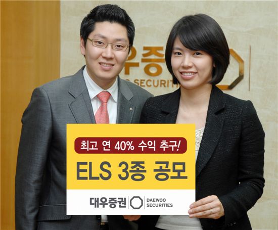 대우증권이 오는 19일부터 최고 연 40% 수익을 추구하는 주가연계증권(ELS) 3종을 공모한다고 18일 밝혔다. 이번 '‘ELS 3종'은 각각 KOSPI200 현대차 한국전력 현대중공업 등을 기초자산으로 하며 총 450억원 규모다.