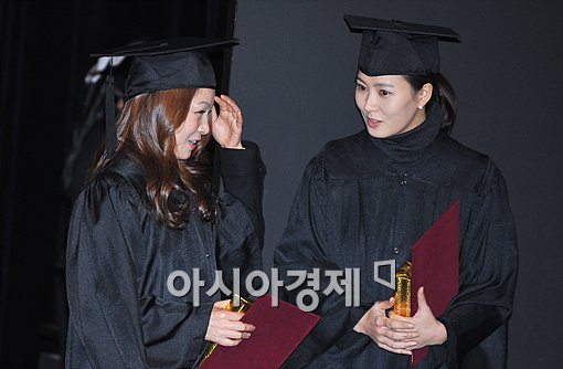 [아시아경제신문 용인(경기)=이기범 기자]왁스(왼쪽), 김선아가 18일 오전 경기도 용인시 경희대학교 국제캠퍼스 예술-디자인대학 대공연장에서 진행된 '2008학년도 학위수여식'에서 공로상을 수여 받고 밝은 미소로 대화를 나누고 있다.