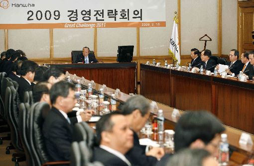 한화는 18일 서울 장교동 한화빌딩 28층 대회의실에서 김승연 회장 및 계열사 대표이사, 경영기획실 임원 등 50여명이 참석한 가운데'2009년 경영전략회의'를 개최하고 올해 경영전략을 확정했다.