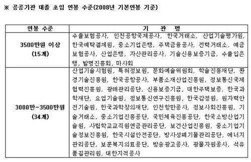 아울러 독립기념관, 국민연금공단, 어촌어항협회 등 23개 기관은 2500만원 이하의 대졸 초임을 주는 것으로 조사됐다.