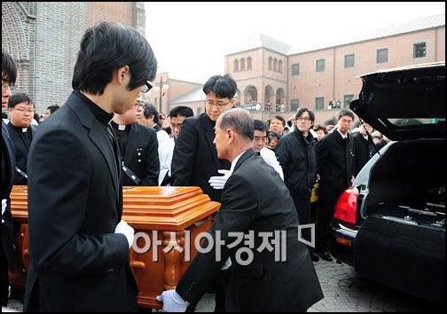 [아시아경제신문 박성기 기자]20일 오전 10시 서울 명동성당에서 열린 김수환 추기경 장례미사에서 미사를 마친 후, 시신이 경기도 용인성직자 묘역으로 옮겨지고 있다.