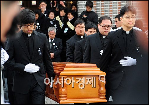 [아시아경제신문 박성기 기자]20일 오전 10시 서울 명동성당에서 열린 김수환 추기경 장례미사에서 미사를 마친 후, 시신이 경기도 용인성직자 묘역으로 옮겨지고 있다.