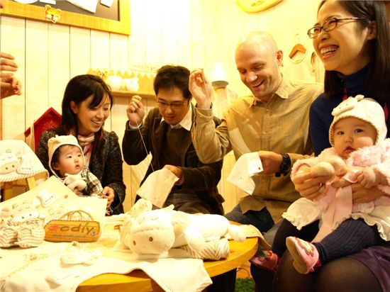서울 코엑스에서 진행중인 '제15회 서울국제 임신 출산 육아용품 전시회'에서 오가닉코튼DIY 부스를 찾은 다문화가정의 예비 아빠·엄마들이 태교를 겸해 유기농면으로 태어날 아기에게 선물할 인형과 육아용품을 만들고 있다.