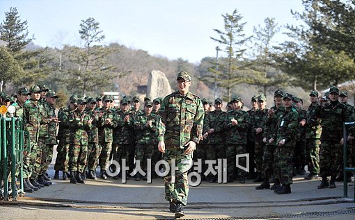 [아시아경제신문 화천(강원) 이기범 기자] 25일 오전 강원도 화천군 27사단 수색대대에서 24개월 간의 군 복무를 마치고 전역한 god 김태우가 위병소를 나서로 있다.