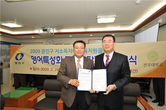 구는 지난 24일 건국대학교와 영어특성화 무료위탁교육에 관한 협약을 체결, 저소득 가정의 자녀 초등학교 1~2학년 학생 30명에게 건대 언어교육원의 초등영어과정을 무료로 수강하는 데 뜻을 같이했다.