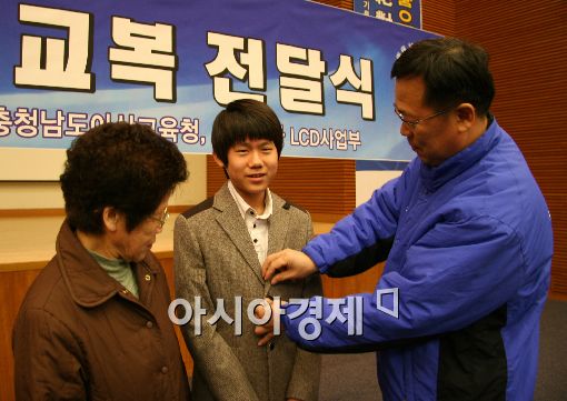 26일 삼성전자에 따르면 이 회사의 LCD 사업부는 이날 충청남도 아산교육청에서 추천을 받은 53명의 학생에게 교복을 입학선물로 전달했다. 이 '사랑의 교복' 전달행사는 삼성전자가 지난 2006년부터 아산교육청과 연계, 시작해온 교육후원 사업으로 올해까지 총 183명의 학생들이 교복을 선물받았다.