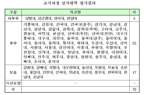 평가 결과 상명대 성균관대 연세대 한양대 등 4개 대학이 최우수 판정을 받았고 가톨릭대를 포함한 55개 대학은 우수 판정을 받았다. 나머지 17개 대학은 보통 판정을 받았으나, 2002년도에 실시됐던 평가에서 10곳에 달하던 개선요망 등급은 1개 대학도 없는 것으로 나타났다.