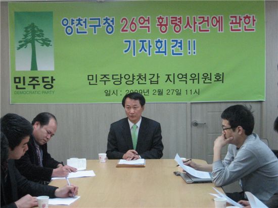 이제학 민주당 양천갑 지역위원장은 27일 오전 기자회견을 갖고 양천구청 장애수당 횡령사건에 대해 책임을 지구 추재엽 양천구청장이 자진 사퇴하는 것이 마땅하다면서 그렇지 않으면 주민소환운동을 통한 퇴진운동을 펼치겠다고 경고했다.