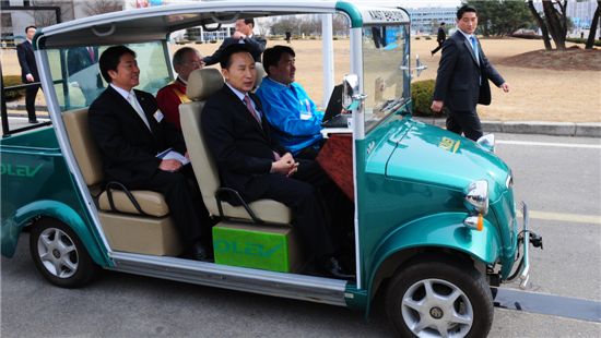 이명박 대통령이 27일 대전 KAIST 학위수여식에 참석하기 앞서 이날 KAIST가 공개한 '온라인 전기자동차'를 시승하고 있다.