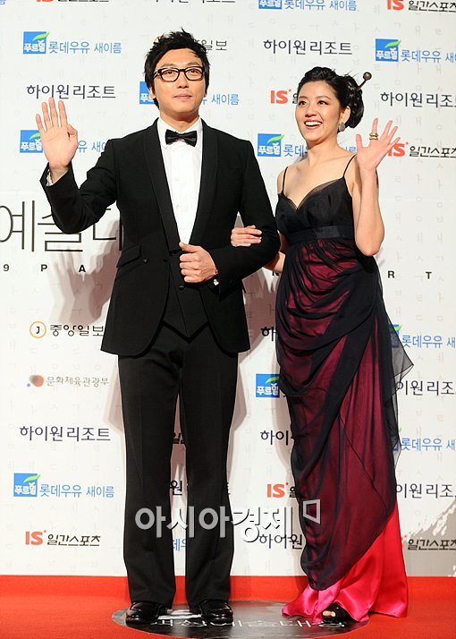 [아시아경제신문 이기범 기자]27일 오후 서울 송파구 올림픽공원에서 열린 '제 45회 백상예술대상'에 참석한 탁재훈(왼쪽), 정미선 아나운서가 포토타임을 갖고 있다.