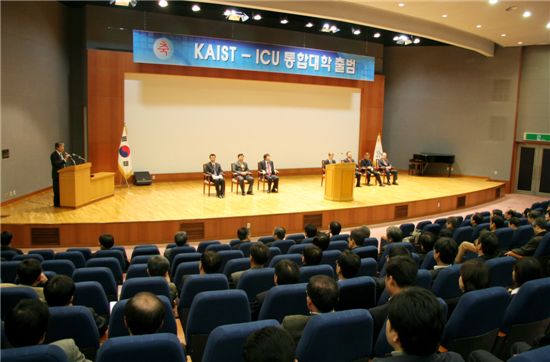 KAIST와 한국정보통신대학교(ICU)의 통합대학 ‘KAIST-ICC(IT Convergence Campus)’ 출범을 축하하기 위한 기념식이 2일 대전 유성구 문지동 ICC(구 ICU) 본관 1층 수펙스 홀에서 열렸다.