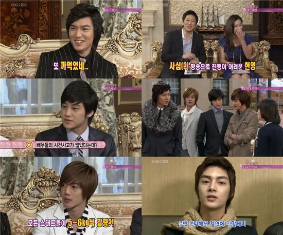 한석준 KBS 아나운서와 현영이 진행을 맡은 이날 방송에서 이민호, 김현중, 김범, 김준은 드라마 '꽃남'의 후일담과 미공개 영상 등을 공개했다.