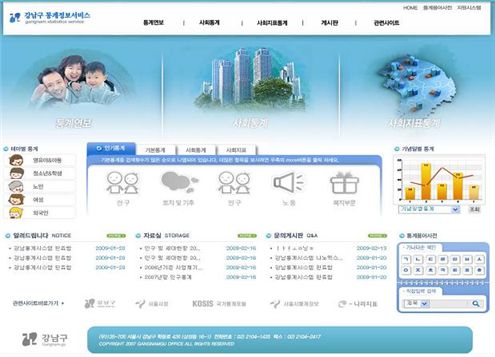 통계정보 사이트(http://gss.gangnam.go.kr)는 미래형 통계사이트로 통계자료를 마음대로 활용할 수 있는 개인맞춤 기능을 갖추고 있는 장점을 갖고 있다.