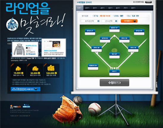 WBC 경기와 게임을 동시에 즐기는 이벤트도 준비됐다. 네오위즈게임즈는 대회 기간 동안 국가대표팀 경기 시작 30분전까지 당일 라인업을 맞추는 사용자에게 게임머니를 지급할 계획이다. 라인업 10명을 모두 맞추면 게임머니 10만캣을, 8~9명은 3만캣, 5~7명을 맞추면 1만캣을 받게 된다. 또 경기 후 추첨을 통해 스포츠 의류와 달력 등 다양한 경품을 지급할 계획이다. 이 외에도 '09년 국가대표유니폼' 아이템을 구매한 사용자를 대상으로 대표팀이 경기에서 승리할 때마다 게임머니 10만캣을 증정할 예정이다.