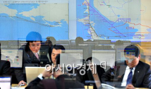 북한이 동해상 북한 영공을 통과하는 우리측 민용항공기에 안전을 담보할 수 없다고 발표해 긴장감이 고조되고 있는 가운데 6일 서울 강서구 오쇠동 아시아나본사 종합통제센터 직원들이 우회 운항항로를 살펴보고 있다.