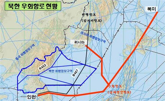 국토해양부는 6일 국적항공사의 북한 비행정보구역을 통과하는 항로(B467)의 사용 대신 일본을 경유하는 우회항로(북태평양항로)를 이용토록 항공사에 지시했다고 밝혔다.