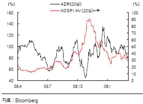 기술적 분석 역시 과매도권으로 해석되고 있다는 점 역시 긍정적 요인이다. 상승종목수와 하락종목수의 등락비율로 계산한 ADR(20일)이 현재 77.9%까지 내려와 있다. (★맨 윗 그림 참조)