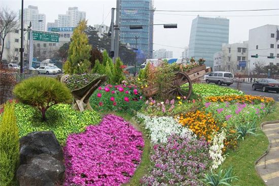 안전지대 화단에는 기존 일년초 위주의 식재패턴을 개선, 소나무와 측백나무, 자산홍, 남천 등 수목 24주와 수호초, 패랭이 등 숙근초 2680본 등을 일년생 봄꽃과 조화를 이루도록 혼합식재한다.