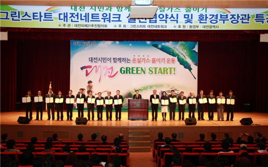 대전시는 11일 시청 대강당에서 이만의 환경부장관과 박성효 대전시장, 시민, 공무원 등 600여명이 참석한 가운데 일상생활에서 온실가스 줄이기를 실천하는 범시민 실천운동인 '그린스타트 대전네트워크' 발대식을 가졌다.