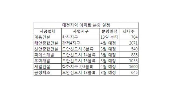 계룡건설 이외에 아파트 시공사업계획을 승인 받은 업체는 ▲태안종합건설 관저 4지구 ▲신안종합건설 도안신도시 8블록 ▲피데스개발 도안신도시 14블록 ▲우미개발 도안신도시 15블록 ▲제일건설 학하지구 2·3블록 ▲금성백조주택 도안신도시 13블록 등 모두 7곳.