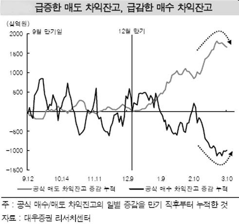 증권가에 따르면 현재 이들이 정리해야 할 선물누적분은 약 1만5000계약. 이중 오늘 당장 프로그램매수로 연결될 환매수 물량은 최소 5000계약 가량이다. 나머지는 지수 등락과 연관성이 떨어지는 롤오버(3→6월물로의 이월)와 만기자동청산 물량이다.