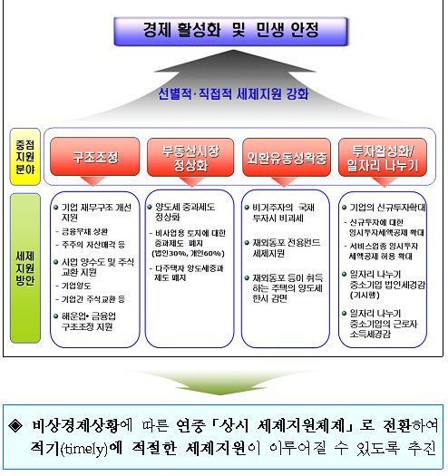 재정부 윤영선 세제실장은 “구조조정·부동산 시장 활성화·일자리 나누기 등으로 나눠서 선별적·직접적 지원이 필요한 분야를 중심으로 지속적인 세제지원을 추진하키로 했다”고 말했다.
