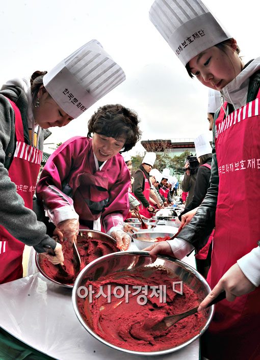 전통장담그기 행사가 열린 15일 서울 남산한옥마을을 찾은 외국인들이 고추장을 직접 만들어 보고 있다.