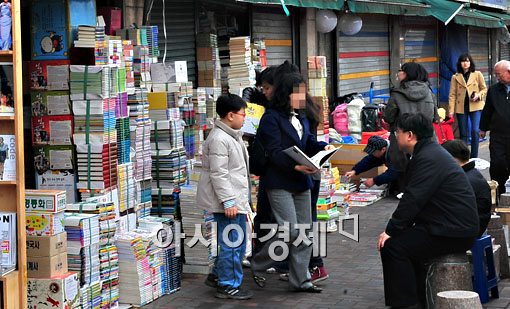 15일 서울 동대문의 헌책방을 찾은 학부모와 학생들이 중고 참고서를 고르고 있다.