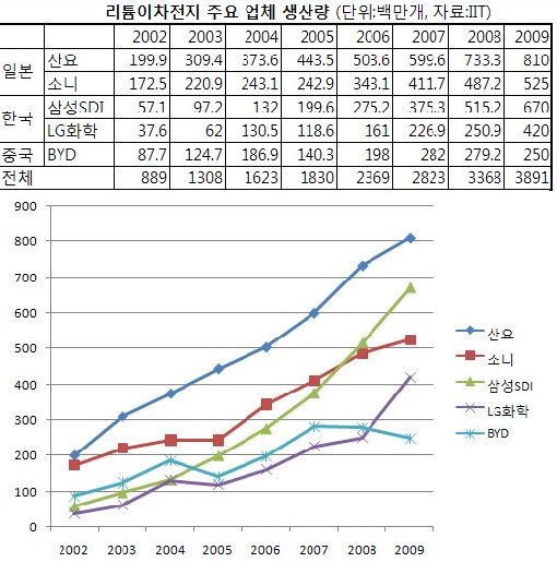 IIT의 최근 보고서에 따르면 지난해 리튬이차전지 생산량에 있어 삼성SDI가 5억15200만개로 소니(5억2500만개)를 제치고 산요(8억1000만개)에 이어 2위에 오른 것으로 집계됐다.