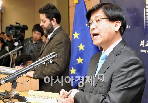 24일 오전 서울 서울 정부중앙청사 별관 브리핑실에서 열린 한-EU FTA 8차협상결과 발표에서 이해민(오른쪽) 수석대표와 베르세로(왼쪽) 수석대표가 협상결과를 발표 하고 있다.