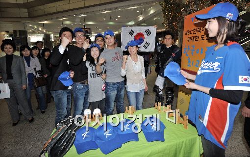 26일 오후 서울 광진구 구의동 강변 테크노마트에서 월드베이스볼클래식(WBC) 준우승을 차지한 대한민국 대표팀의 위대한 도전을 기념하기 위한 야구모자 무료 증정행사에서 시민들이 파이팅을 하고 있다.