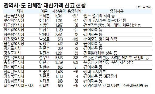 가장 많이 재산이 늘어난 단체장은 이완구 충남도지사로 배우자 소유의 성남 대지 가격 인상과 부친 재산 상속으로 6억원이 늘어났다.