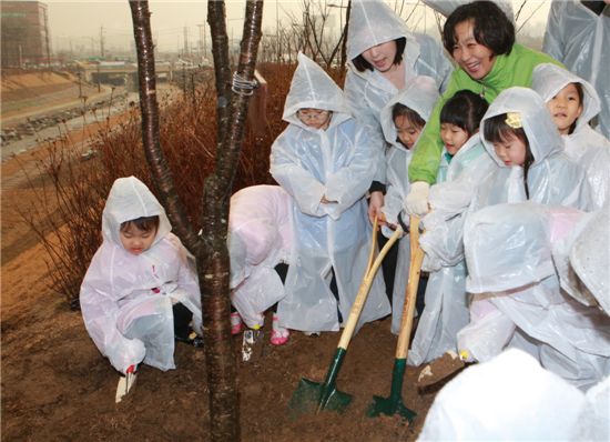 송파구는 26일 식목일을 앞두고 최근 자연형 하천으로 새롭게 태어난 장지천 산책로에 주민들이 왕벚나무를 심었다. 김영순 구청장이 아이들과 함께 왕벚나무를 심은 후 즐거워하고 있다.