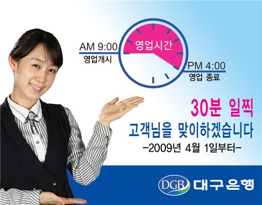 이는 전국 금융노사의 합의에 따른 것으로 대구은행 고객은 30분 일찍 금융서비스를 이용가능하게 됐다.