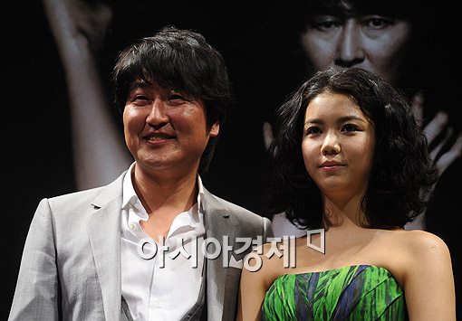 [아시아경제신문 이기범 기자]송강호(왼쪽), 김옥빈이 31일 오전 서울 압구정 CGV에서 진행된 영화 '박쥐' 제작보고회에서 포토타임을 갖고 있다.